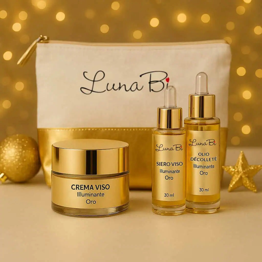 Elegante scrigno dorato che racchiude un trio raffinato di trattamenti per la cura del tuo viso: